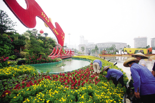 中心廣場排花卉迎國慶,圖為園林工人在擺放鮮花 本報記者 鄭琳東 攝