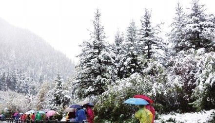 昨天中午12點,九寨溝景區海拔超過3000米的長海和原始森林景點突然下起了鵝毛般的大雪,這讓游客興奮不已。他們堆雪人,打雪仗,和雪人合影留念。