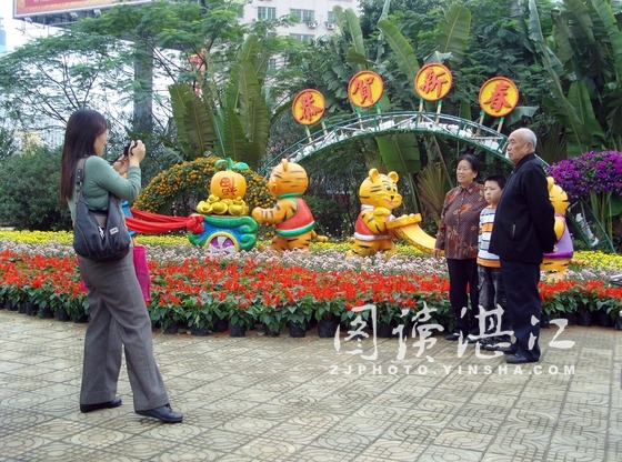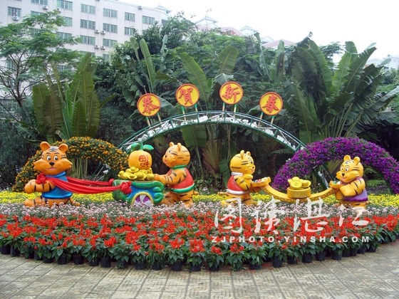 這些泡沫雕塑分別擺在濕地公園的東西兩面路口和中心廣場,制造有老虎,金童玉女,各種蔬果等,栩栩如生,其主題是吉祥如意 、招財進寶、虎迎新春。