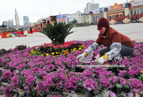 11日,園林工人正在南昌市八一廣場擺放鮮花。據了解,為迎接春節,園林部門在八一廣場擺放了6萬盆各種鮮花扮靚八一廣場。