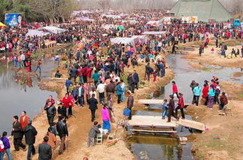 3月24日,舊街“花朝節”吸引了眾多市民前來。近日,第三屆舊街花朝文化旅游節在武漢市新洲區舉行。來自五省二十多個市縣的農民和商家在舊街三廟河河灘上搭起商棚,交易耕牛、藥材、日用品等。據介紹,民間有每年農歷二月十五是百花生日之說,俗稱“花朝節”。     新華社發(陳明 攝)