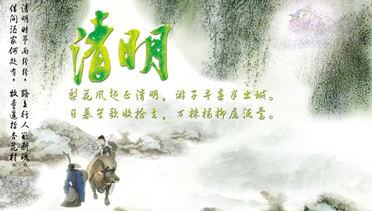 按照舊的習俗,掃墓時,人們要攜帶酒食果品、紙錢等物品到墓地,將食物供祭在親人墓前,再將紙錢焚化,為墳墓培上新土,折幾枝嫩綠的新枝插在墳上,然后叩頭行禮祭拜,最后吃掉酒食回家。唐代詩人杜牧的詩《清明》曰:"清明時節(jié)雨紛紛,路上行人欲斷魂。借問酒家何處有?牧童遙指杏花村。"寫出了清明節(jié)的特殊氣氛。直到今天,清明節(jié)祭拜祖先,悼念已逝的親人的習俗仍很盛行。