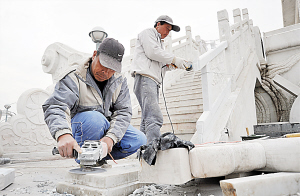 從前天開始,定制的天石舫漢白玉構件運抵天津,聘請的石匠也來到天津展開維修工作。他們在考察了損毀部位后,先對損壞的殘余石件碎頭兒進行清除,并用工具剔除以前粘接用的膠痕殘渣。為了安裝后的構件不從主體上脫落,石匠們還特意在榫卯處下工夫,以加強其牢固性。截至昨日上午,二樓丟失的一段漢白玉護欄已經安裝完畢。接下來,工人們要做的主要工作就是把登船臺階處斷裂倒塌的浮雕刻花石欄板組裝到天石舫上。從現場的石雕建筑構件來看,其上的浮雕圖案是按照老樣子雕刻制作的,浮雕花草頗有立體感。據現場的施工人員介紹,這次修復天石舫因損壞程度較大,至少還得用上三四天才能完工。