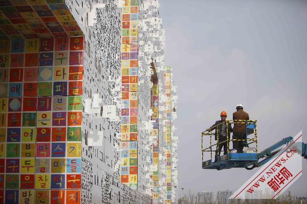 4月18日,施工人員在韓國(guó)館外墻進(jìn)行施工。