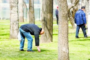 春暖花開、萬物復蘇,在頤和園等公園內,有些游人在剛泛綠的地上亂挖野菜。園林部門提醒市民:不是所有野菜都可食用,誤食可能發(fā)生危險,而且挖野菜也容易造成水土流失。 記者 李繼輝攝
