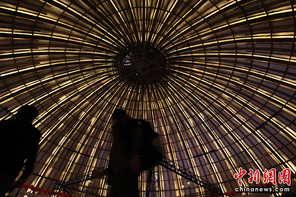 5月2日,上海世博會是第一個正式提出“低碳世博”理念的世博會,圍繞著這樣的理念,上海世博園區內的低碳元素比比皆是。圖為印度館內制的世界最大穹頂,這個竹制穹頂上方是小型風力發電裝置和太陽能電池板,為整個場館提供綠色清潔能源。中新社發 湯彥俊 攝