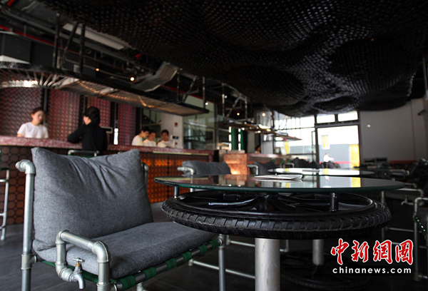 5月2日,上海世博會是第一個正式提出“低碳世博”理念的世博會,圍繞著這樣的理念,上海世博園區(qū)內(nèi)的低碳元素比比皆是。圖為世博倫敦零碳館內(nèi)由廢舊輪胎、水管、瓶子組成的“零碳酒吧”。中新社發(fā) 湯彥俊 攝
