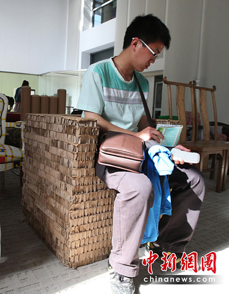 5月2日,上海世博會是第一個(gè)正式提出“低碳世博”理念的世博會,圍繞著這樣的理念,上海世博園區(qū)內(nèi)的低碳元素比比皆是。圖為世博倫敦零碳館內(nèi)由廢舊紙箱做成的沙發(fā)。中新社發(fā) 湯彥俊 攝