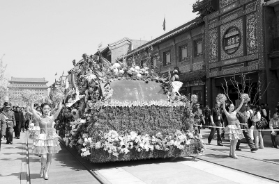 5月1日,前門大街舉辦首屆花卉展。中外游客徜徉在萬束鮮花裝扮的古街上,感受著獨特韻味。圖為在修繕一新的前門大街,花車走街活動正在進行。