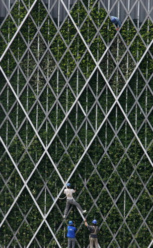 “綠墻”的雛形在2005年的日本愛知世博會上可以找到,在愛知世博園中央的“愛·地球廣場”旁邊,有一面長150米、由樹木組成的大型生態墻——“生命之墻”,在美化環境之余,可以幫助園區吸收二氧化碳,降低夏季溫度。