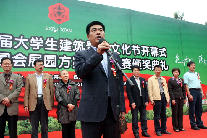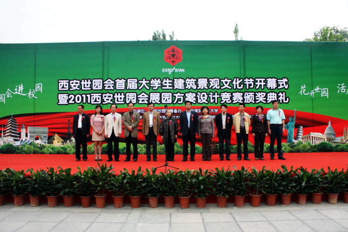 5月17日下午,西安世園會首屆大學生建筑景觀文化節(jié)開幕式暨展園方案設計競賽頒獎典禮在西安建筑科技大學隆重舉行。中國工程院院士張錦秋,浐灞生態(tài)區(qū)管委會主任、世園會籌備辦主任楊六齊,浐灞生態(tài)區(qū)管委會副主任、世園會籌備辦副主任徐軍前出席開幕式并為榮獲展園方案設計競賽“優(yōu)秀設計獎”和“杰出創(chuàng)新設計獎”的學生代表頒獎,西安建筑科技大學等八所高校負責人及千余名大學生代表參加了開幕儀式。