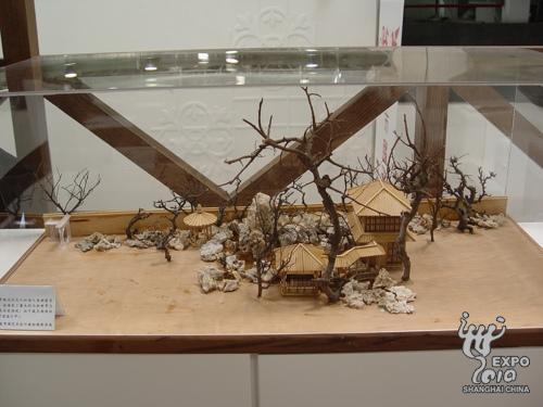 威尼斯案例館內擺放著蘇州當代藝術家設計制作的中國園林“達園”模型:在半米乘一米的沙盤上,五座不同材質的小橋分別代表了金水火土五行,太湖石用風棱石取代,月洞門用玻璃磚堆砌,透明樹脂灌作池水,整個園林之精巧,如夢似幻。