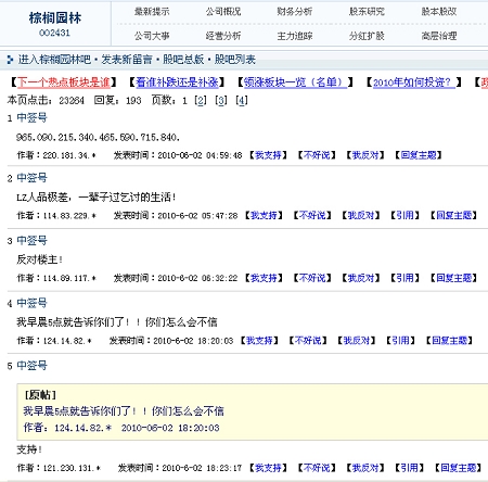 在某網(wǎng)站“棕櫚園林股吧”中,一份“中簽號(hào)曝光貼”在6月2日的凌晨4點(diǎn)59分48秒發(fā)表。