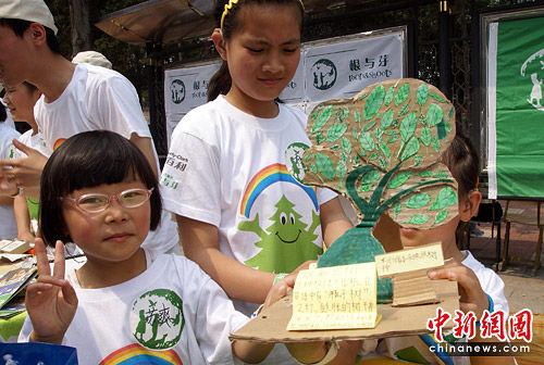 6月5日是“世界環境日”,北京數所學校的“根與芽”小組學生到北京育才中學現場場展示了他們的愛樹行動成果和環保創意!熬G色陽光行動”是珍古道爾(北京)環境文化交流中心暨根與芽北京辦公室主題項目之一,2010年綠色陽光行動的主題是愛護樹、保護森林,北京市約有40所中小學校及高校的根與芽小組參加,他們在指導老師和大朋友的協助下開展為期兩個月的與保護樹木相關的豐富多彩的活動。今天的分享會,既是他們兩個月來活動成果的展示,也是他們與更多人分享環保理念的好機會。