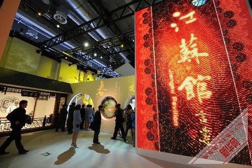 江蘇館位于A片區。以“園”為理念,結合多種科技手段,生動地創造了一片虛擬園林。展館外觀由組合式動靜兩層LED貼膜大屏風構成,大開大闔,顯示了江蘇的開放和靈動的活力!疤K韻流芳”、“幽蘭雅韻”、“春華秋實”、“玉色臨風”、“物聯天下”、“七色光譜”、“江海經略”、“生命奇緣”和“錦繡江蘇”等主要展項充分展示了江蘇悠久的歷史和深厚的文化底蘊,以物聯網、光伏、生物醫藥等為代表的高新技術產業的發展成就,展現了“理想之園”的精華。