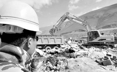 武警水電部隊官兵在結古鎮利用大型機械清運建筑廢墟。 新華社記者侯德強攝