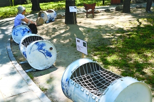 這些小品是中央美術(shù)學(xué)院學(xué)生在6周時間內(nèi)做成的,包括休閑座椅、游戲設(shè)施等。所用材料全都是生活中不起眼的廢舊物品,如水瓶蓋、塑料飲料瓶、廢棄羽毛球、自行車內(nèi)胎、舊鋼管、啤酒瓶箱、汽油桶、廢報紙等,“這里頭,有的東西有人回收,有的東西沒人回收。比如說廢棄的羽毛球,我們調(diào)研了北京20多所大型羽毛球俱樂部及健身館,發(fā)現(xiàn)沒有一家廠商或個人回收,最后全給當(dāng)成垃圾扔掉了。”中央美院一名學(xué)生不無惋惜地說道。