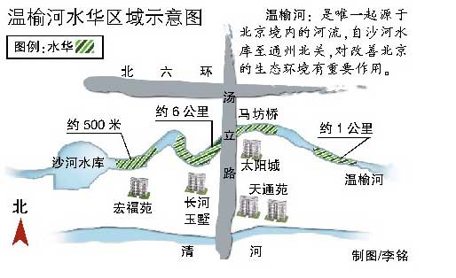 溫榆河馬坊橋河段,綠藻將水面蓋得嚴嚴實實,幾乎看不到河水,岸邊的水藻已開始變黑、腐爛。一名在岸邊散步的男子將半塊磚扔進河中,砸出一片水洼。不到3秒,水洼便被水藻吞沒。雖然下著小雨,但河面死氣沉沉,看不到一個水泡和漣漪。在水庫附近,河中不時有野鴨在游弋,水洼處偶有幾片綠藻。但馬坊橋東約5公里處的一處橡膠水壩成為了分水嶺。水壩以西河水叮咚,水壩東側的大片水藻望不到邊。