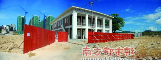 汕頭市海濱路。挖地基、打樁,一派如火如荼的施工景象。這原本是破舊的汕頭老城西區一角,現在屬海濱路西延片區改造建設項目,目前正在建設一個大型濱海住宅區。南都記者現場看到,篾搭成的籬笆、鐵板焊接的圍墻、磚砌的高墻形成了一道綿延數里的密實圓圈。一座紅磚白柱的兩層西洋新古典建筑風格洋樓———海關鐘樓正好被箍在里頭,如孤島般屹立其中,狀如“釘子戶”。