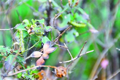 上午,記者趕到世紀佳園,看到了市民所說的“毛毛蟲”。小區2號樓前的綠籬損失尤為慘重,順著六七十米長的矮冬青看過去,幾乎每隔幾步都能發現啃食樹的“毛毛蟲”。這些“毛毛蟲”通體綠色,它們爬過的地方,幾乎都能看到密集的“白網”。不少被蠶食過的矮冬青,葉子灰黃,有的甚至已經死去!坝腥苏f這蟲子是美國白蛾,有人說這蟲子像‘吊死鬼’!币粯I主說。