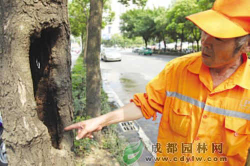 由于手邊沒有什么滅火工具,他急中生智,用手中的簸箕舀了路邊的積水就往樹上澆,“當時也找不到水源,可能是灑水車經過時留下的一灘水正好在旁邊,我就用簸箕舀了來滅火!睂O師傅告訴記者,隨后他又發現明火是從樹干上的一個樹洞里冒出來的,但是水澆進去,不一會火苗又冒上來了。這時,看到煙霧的古南都飯店工作人員也拿著滅火器出來滅火,這才把火撲滅。
