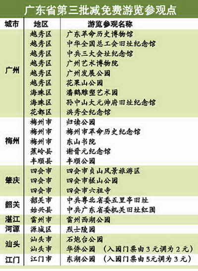 在此基礎(chǔ)上,省物價局再次向社會公布了全省第三批免費游覽參觀點名單共計22個單位,共涉及廣州、梅州、肇慶、韶關(guān)、湛江、河源、汕頭、江門等8個市(名單見附表)。此前,2009年5月1日,廣東首批推出了174個免費游覽參觀點;同年10月1日,省物價局又再次推出第二批361家免費游覽參觀點。