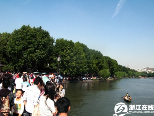 泛舟西湖,游湖賞桂,陽光下游人們興致頗高。