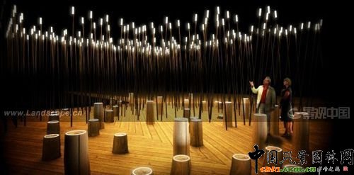 這片樹樁是場地材料——鋪地木板——的直接延續,與木桿叢林一起,賦予了鋪地木板這種建筑元素新的寓意。
