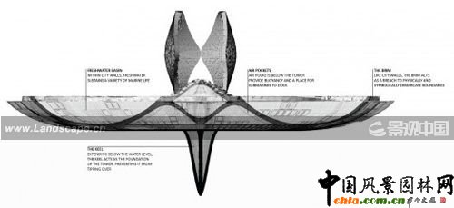 隨著人口的增長,建筑中還可以增加許多插件部分,增加建筑高度,擴展建筑范圍,這就像填海工程一樣。海平面下有長達800米的“倒置塔”,可以維持建筑直立漂浮,不會傾倒。圍繞在建筑周圍的是一個巨大的碗狀結構既可以提供浮力,又可以像“護城墻“一樣保護建筑不受海水的侵襲。這個漂浮島將乘風破浪,環游世界,直到找到一片富饒美好的新天地。