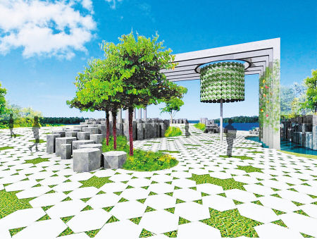 走進展園,打眼一看,翠綠的大樹在白色柱子的映襯下格外搶眼,定睛一瞅,原來樹上是好幾十個綠色小風車,組成了一棵大樹的樣子。陣陣風吹過,幾十個小風車一起轉動起來,還能聽見“沙沙沙”如樹般的聲音,這是一棵綠色風能樹,風車轉動帶動樹下水流至樹頂,然后徐徐流下,經過垂直綠化植物,重回水池。在這里,你可以看到自然能量的轉化,感受風動、水動、心動的效果。