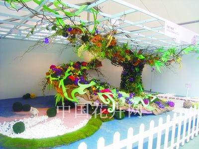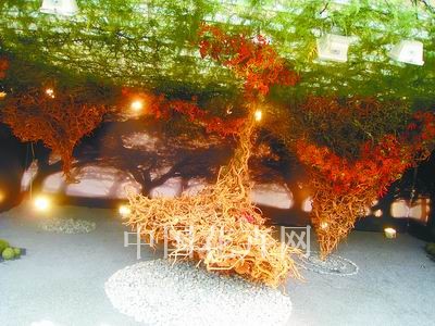 雖然整體水準有所下降,但還是有一些作品可圈可點。比如日本水上雅夫花藝研究院的參展作品,命題帶有顯著的日本文化色彩,層次非常鮮明、多樣,甚至令我的數碼相機無法“描摹”。創作該作品的日本花藝師水上雅夫,將作品深秋森林的感覺營造得十分到位,芭蕉扇、樹根、樹皮粘貼等手法運用十分嫻熟老倒,作品讓人感覺到童話世界的靜寂與和諧。