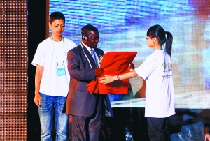 ▲“設(shè)計(jì)改變世界——國際知名設(shè)計(jì)師中國行”在深啟動(dòng)。開幕式上,深圳志愿者向聯(lián)合國官員送上“選擇低碳生活”萬人簽名橫幅。