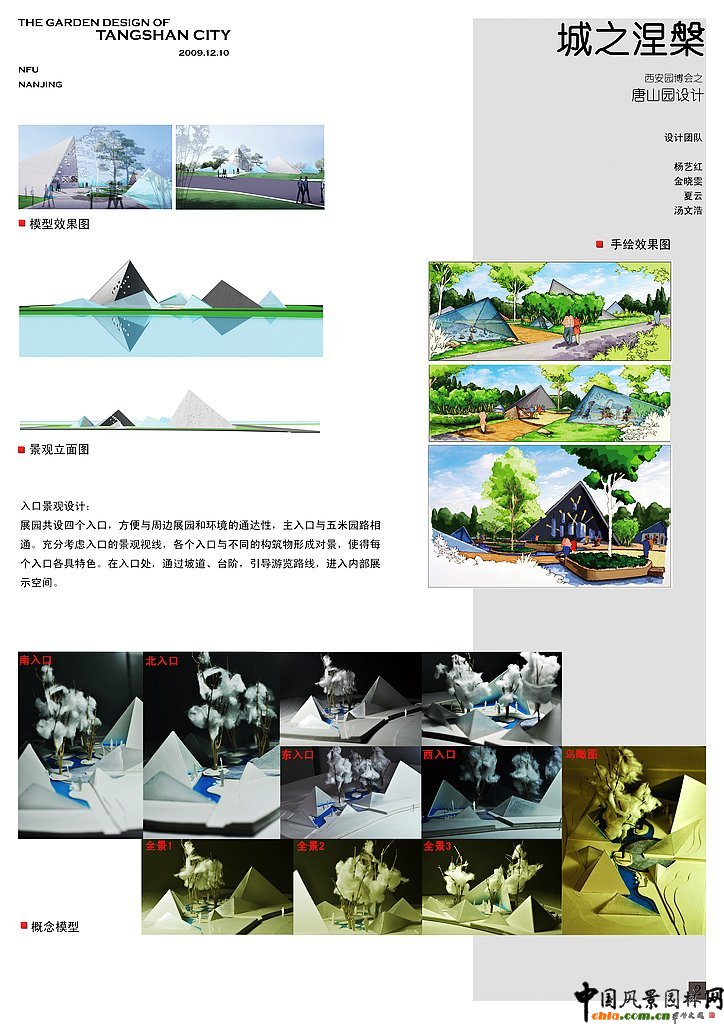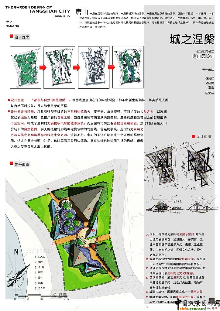 中國風景園林網訊 為配合2011西安世界園藝博覽會唐山展園的設計,提高南京林業大學風景園林專業大學生的規劃設計水平,鼓勵和激發大學生的創造性思維,引導大學生對風景園林學科和行業發展前沿性問題的思考,南京林業大學風景園林學院聯合河北省唐山園林局舉辦"2011西安世界園藝博覽會唐山園設計競賽"。以下為一等獎作品。 一等獎:城之涅磐 設計者:楊藝紅、金曉雯、夏云、湯文浩 城之涅槃--西安世園會唐山園設計 唐山一座在廢墟中新生的城市,一座揚帆海洋的城市,一座充滿生態傳奇的城市。歷經十年重建、十年振興、十年快速發展,她經歷了鳳凰涅槃般的復活再造,她創造了地震恢復后的奇跡,她打造了一個獨具唐山特色,山、水、園、林、路配套的城鄉一體化大生態園林綠化格局的新型生態城市。她曾被預言“將被從地球上抹掉”,而今奇跡版地崛起在渤海之濱,展翅欲飛。 設計主題--“都市與自然·鳳凰涅槃”,試圖表達唐山在任何環境裂變下都不斷新生的精神,其實質是人類與自然不斷抗爭,尋求和諧共榮的歷程。 ![]() ![]()