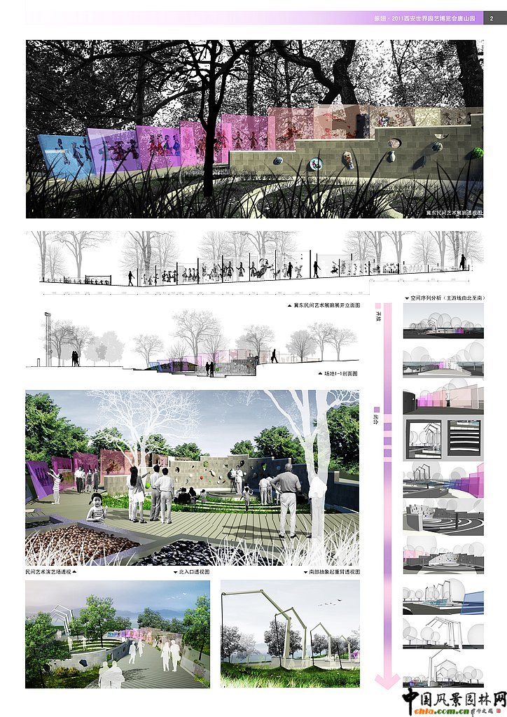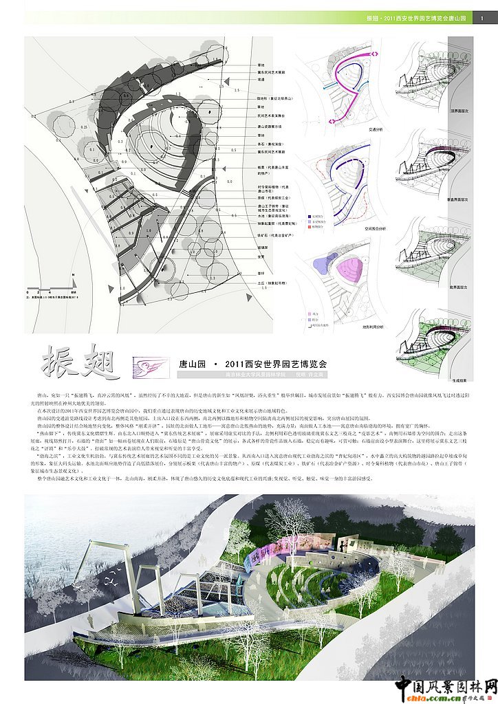 中國風景園林網訊 為配合2011西安世界園藝博覽會唐山展園的設計,提高南京林業大學風景園林專業大學生的規劃設計水平,鼓勵和激發大學生的創造性思維,引導大學生對風景園林學科和行業發展前沿性問題的思考,南京林業大學風景園林學院聯合河北省唐山園林局舉辦"2011西安世界園藝博覽會唐山園設計競賽"。以下為二等獎作品。 二等獎:振翅 設計者:倪明、許立南 振翅--西安世園會唐山園設計 唐山,宛如一只“振翅騰飛,直沖云霄的鳳凰”,雖然經歷了不幸的大地震,但是唐山的新生如“鳳凰涅槃,浴火重生”般舉世矚目,城市發展前景如“振翅騰飛”般有力。西安世園會唐山園就像鳳凰飛過時透過陽光的照射映照在神州大地優美的翎羽。 在本次設計的2011年西安世界園藝博覽會唐山園中,我們重點通過表現唐山的歷史地域文化和工業文化來展示唐山地域特色。 唐山園的交通游覽路線設計考慮到南北兩側是其他展園,主出入口設在東西兩側,南北兩側以微地形和植物空間隔離南北側展園的視覺影響,突出唐山展園的氛圍。 ![]() ![]()
