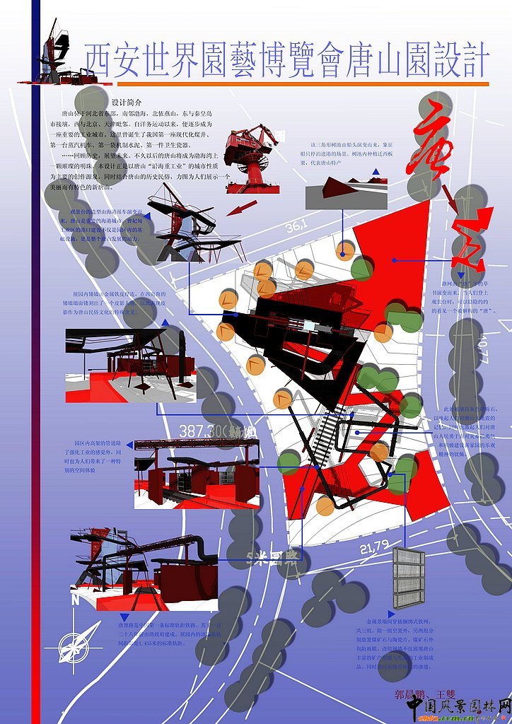 中國風景園林網訊 為配合2011西安世界園藝博覽會唐山展園的設計,提高南京林業大學風景園林專業大學生的規劃設計水平,鼓勵和激發大學生的創造性思維,引導大學生對風景園林學科和行業發展前沿性問題的思考,南京林業大學風景園林學院聯合河北省唐山園林局舉辦"2011西安世界園藝博覽會唐山園設計競賽"。以下為第六名作品。 西安世界園藝博覽會唐山園設計 設計簡介 唐山位于河北省東部,南鄰渤海,北依燕山,東與秦皇島接壤,西與北京、天津毗鄰。自洋務運動以來,便逐步成為一座重要的工業城市。這里曾誕生了我國第一座現代化煤井、第一臺蒸汽機車、第一袋機制水泥、第一件衛生瓷器。 ……回顧歷史,展望未來。不久以后的唐山將成為渤海灣上一顆璀璨的明珠。本設計正是以唐山“沿海重工業”的城市性質為主要的創作源泉,同時結合唐山的歷史民俗,力圖為人們展示一個美麗而有特色的新唐山。 ![]() ![]() 西安世園會唐山園設計一等獎作品 西安世園會唐山園設計二等獎作品 西安世園會唐山園設計三等獎作品