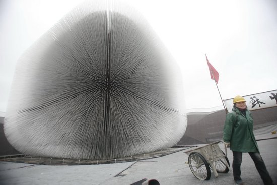 這個建筑物周身插滿60,000根透明的桿,會在微風中輕搖,隨著天氣的變化而擺動。 2010年3月23日,一股強冷空氣從北方吹來,本已春意盎然的上海,驟然狂風大雨,氣溫急降。大街小巷的人們,紛紛又套上了厚厚的冬衣。但是,陰冷的天氣不影響世博園區的熱火朝天。在上海世博局工作人員的配合下,記者進入世博園區核心區域——“一軸四館”氣勢宏偉,各國展館各出奇招。唯一遺憾的,就是所有展館都禁止進入內部采訪。用工作人員的話來說,保密,是為了5月1日的驚喜。 一軸四館:氣勢宏偉 上午10點,記者通過預約,來到位于上海市浦東南路的上海世博會事務協調局,經過30多分鐘的等候后,通過抵押記者證的方式,從新聞宣傳部拿到了進入世博園區的臨時通行證(此前進入深圳館等處采訪是通過非正式渠道)。 進入世博園區之后,記者直奔最負盛名的“一軸四館”。這里是浦東世博園區的中心地帶。從耀華路入口,一直到黃浦江邊,有一條長約1公里的“玉帶”狀建筑,這就是世博軸。世博軸是十足的“低碳”產品:首創了“陽光谷”結構,入口及中部沿縱向設置了6個標志特征明顯的巨型圓錐狀陽光谷結構,自然光透過陽光谷玻璃傾瀉入地,完全滿足了下層空間的采光需求。 世博軸的兩側,分布著四個最核心的場館:位于世博軸西側的世博主題館;位于濱江綠地內的世博中心;位于世博軸以東的世博文化中心;最具視覺沖擊力的莫過于位于世博軸東側的中國國家館了。“世博會之后,中國國家館必將成為上海新的地標性建筑。”工作人員介紹說。 國家館:驚世之作不斷 從“一軸四館”往西南方向行走,就到了世博園區的另一個精華部分:國家館片區。來自全世界的智慧在這里碰撞,各國的設計師使出渾身解數,通過一座建筑展示自己國家的傳統文化與價值訴求。 最令人叫絕的當屬英國館了。當記者在園區向布展工人詢問英國館在哪里時,很多工人異口同聲地說,就是那個“刺猬”一樣的東西,就在前面!走近一看,英國館真可謂奇特:的確像個刺猬,中間是一個圓圓的球狀物體,無數根觸須從球里面“長”出來,向四面八方伸去。原來,英國館的主題是“種子圣殿”,寓意是,包裹在其中的種子圣殿是英國送給中國的一份象征兩國友誼的禮物。 保密:請收起好奇心 雖然記者帶有世博局的臨時通行證,但并不意味著在園區內暢行無阻。記者先后試圖進入中國國家館、世博文化中心、英國國家館等展館,都被安保人員“趕”了出來。在世博文化中心,安保人員小唐對記者說,世博會的很多創意是必須保密的,除核心主創人員外,無關人員一律不得入內,即使工作需要進入,也不得攜帶照相、攝像器材。一句話,現在保密,是為了5月1日的驚喜。