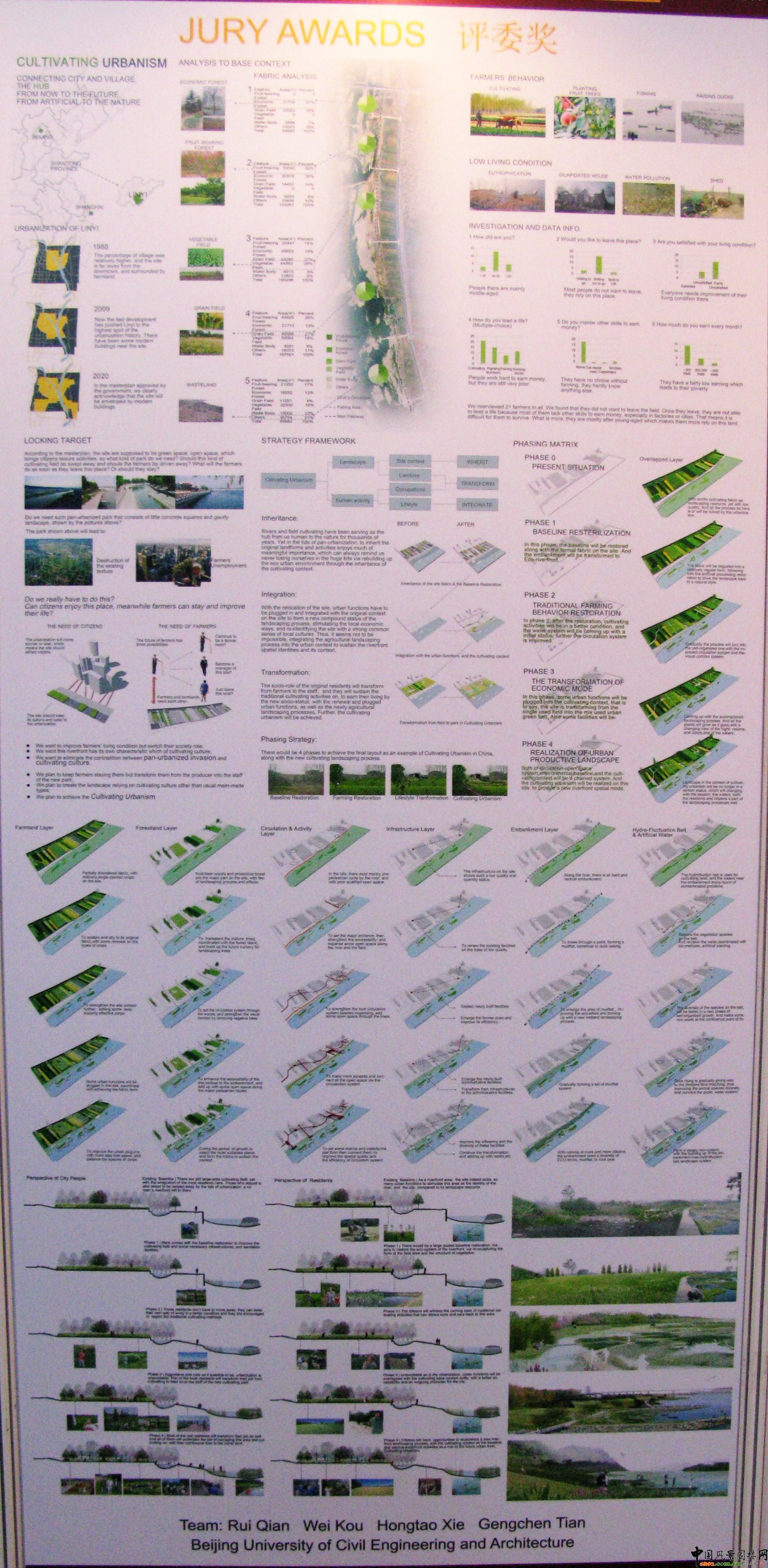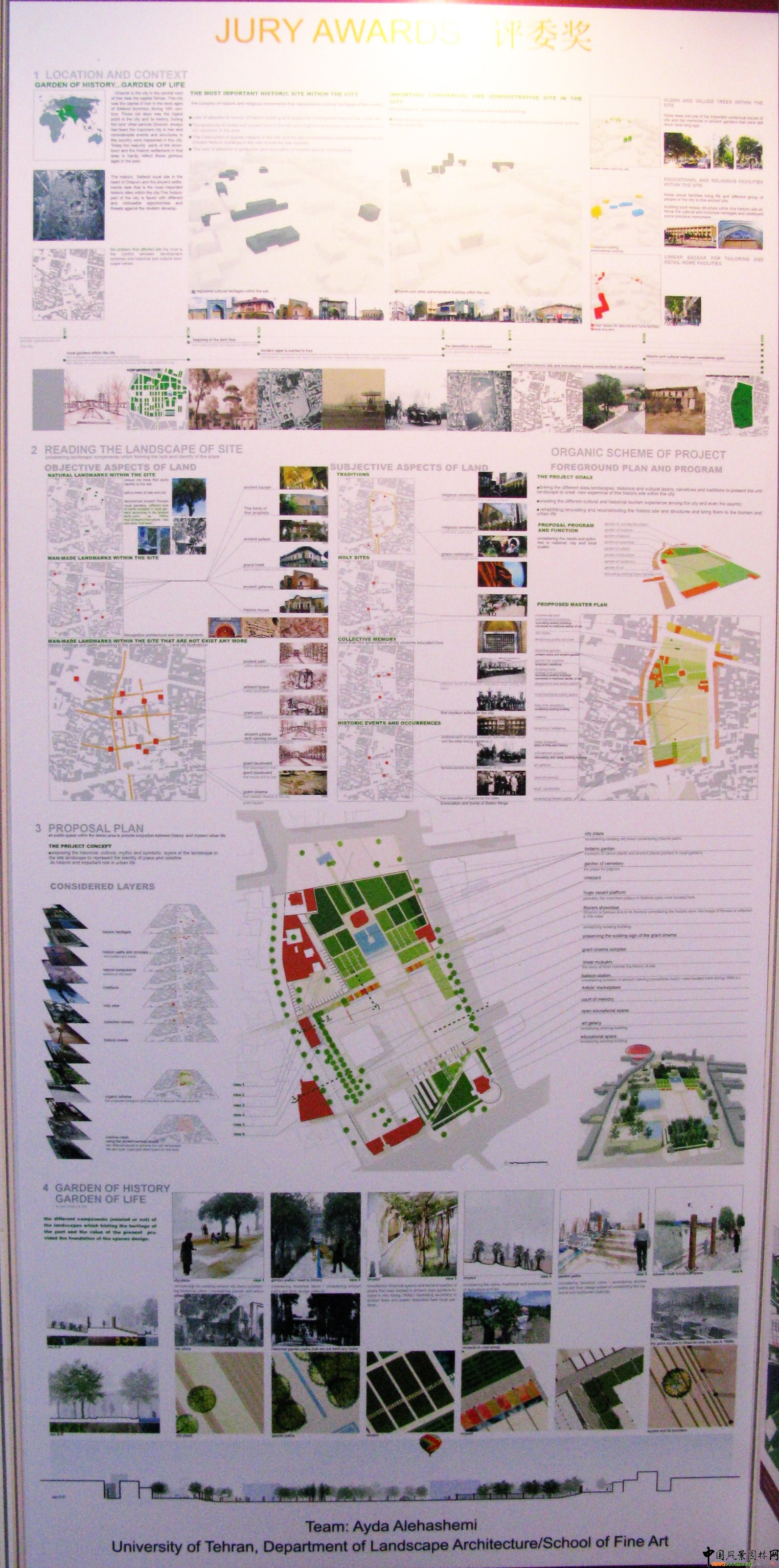 中風景園林網訊 在國際風景園林師聯合會(IFLA)第47屆世界大會大學生設計競賽中,中國學生包攬競賽的一、二、三等獎(點擊查看詳情),以及11個評委會獎,充分展示了中國出現了前所未有的蓬勃局面。 評委會獎獲獎名單(15組): 中國 北京建筑工程學院 錢睿 寇維 解洪濤 田耕辰 伊朗 德黑蘭大學 Ayda Alehashemi 中國 西安建筑科技大學 袁媛 仇曉霞 柯杰文 宋湘澎 劉文博 中國 北京林業大學 夏宇 田習倩 化雁林 李倞 李利 美國 路易斯安那大學 R. Duplechain K. Kirb R. Reed N. Menart 中國 北京林業大學 鮑沁星 張敏霞 劉思萌 中國 同濟大學 陳楓 美國 路易斯安娜大學 Josh LaBrode 中國 北京林業大學 劉家琳 李萍 朱時雨 張雪輝 盧亮 中國 北京林業大學 張晉 郁聰 張洋 畢汝濤 趙睿 中國 北京林業大學 陳崇賢 孟洋 王金瑾 徐筱婷 荷蘭 瓦格寧根大學 P. Hermens J. Van Der Salm C. Van Der Zweet 中國 北京林業大學 董麗 蔡瓊如 張慧 束冬冬 孫帥 中國 北京林業大學 趙晶 劉通 張鋼 中國 北京林業大學 王樂礫 嚴巖 林元珺 陶悅珊 李尚乘 以下是評委會獎獲獎作品展板(依名單順序,每頁兩個作品): 中國 北京建筑工程學院 錢睿 寇維 解洪濤 田耕辰 作品: ![]() 伊朗 德黑蘭大學 Ayda Alehashemi 作品: