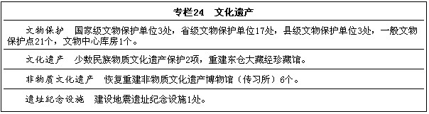 第三節 文化遺產保護 文物保護。對國家級、省級、縣級文物保護單位和重要文物點實施保護性清理、維修加固和修復重建。對館藏文物、寺內文物進行認定和修復。維修加固和重建受損的博物館、文物庫房、文管所。注重文物保護與當地居民生活特別是宗教生活的和諧共存,做好文物保護修復與開展傳統宗教文化活動的協調工作。 非物質文化遺產保護。重點恢復重建受損國家級、省級非物質文化遺產和博物館。培養民族民間文化傳人,加強卓舞、依舞、民歌、安沖藏刀鍛制技藝等的傳承。 地震紀念設施。保留必要的玉樹地震遺址,建設紀念設施。