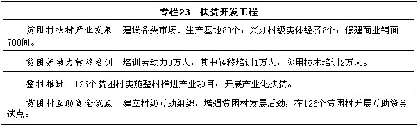 第二節 扶貧開發 貧困村產業扶持。依托當地資源優勢,建設高標準日光節能溫室,發展蔬菜等經濟作物種植、馬鈴薯種植、畜牧業養殖。發展民族家庭手工業和小型農產品加工業,扶持貧困村、貧困戶建立綜合性農貿市場和專業市場,多渠道增加受災農牧民收入。開展貧困村互助資金試點。 易地扶貧搬遷。對居住在生態環境惡劣、存在地質災害隱患等地區的貧困人口,有計劃地實施易地搬遷,集中安置,配套基礎設施建設,扶持產業發展。 勞動力轉移培訓。對青壯年勞動力進行“雨露計劃”和實用技術培訓,開展以中長期培訓為主的民族服裝加工、民族用品加工、機械修理、藏繡等各種專業的技能培訓,提高貧困群眾自我發展能力。