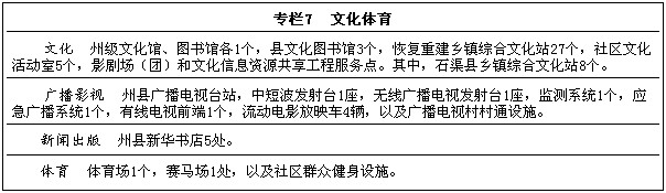第三節(jié) 文化體育 文化場館。恢復(fù)重建州、縣、鄉(xiāng)、村四級公共文化服務(wù)設(shè)施,重點恢復(fù)重建文化館、圖書館、影劇院及鄉(xiāng)鎮(zhèn)綜合文化站、村文化室、社區(qū)文化中心。恢復(fù)重建文化信息資源共享工程。統(tǒng)籌建設(shè)州縣同城文化設(shè)施。 廣播影視。恢復(fù)重建廣播電視功能,重點恢復(fù)重建廣播電臺、電視臺和無線廣播電視發(fā)射臺站、有線電視網(wǎng)絡(luò)、監(jiān)測臺站,以及廣播電視村村通和農(nóng)村電影放映設(shè)施。提高藏語廣播影視節(jié)目譯制制作能力。 新聞出版。恢復(fù)重建新華書店、公共閱報欄、農(nóng)家書屋,支持藏文圖書出版印刷等文字工程建設(shè)。 體育設(shè)施。恢復(fù)重建民族傳統(tǒng)體育場、高原訓(xùn)練和群眾健身設(shè)施等。
