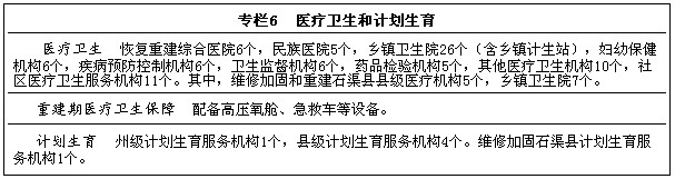 第二節(jié) 醫(yī)療衛(wèi)生 公共醫(yī)療衛(wèi)生。全面恢復(fù)州、縣、鄉(xiāng)、村四級基本醫(yī)療、公共衛(wèi)生服務(wù)體系,恢復(fù)重建州縣兩級醫(yī)療和疾病預(yù)防控制、婦幼保健、衛(wèi)生監(jiān)督、食品藥品檢驗機(jī)構(gòu),以及鄉(xiāng)鎮(zhèn)衛(wèi)生院、村衛(wèi)生室。加強(qiáng)鼠疫、碘缺乏病、包蟲病、大骨節(jié)病、高原心肺病等傳染病和地方病防治能力建設(shè),提高醫(yī)療衛(wèi)生應(yīng)急處置能力。統(tǒng)籌民營醫(yī)療機(jī)構(gòu)恢復(fù)重建。加強(qiáng)中醫(yī)和藏醫(yī)醫(yī)療服務(wù)體系建設(shè),積極扶持藏醫(yī)藥發(fā)展。 計劃生育。恢復(fù)重建計劃生育服務(wù)機(jī)構(gòu)。加強(qiáng)基層計劃生育、婦幼保健與其他醫(yī)療衛(wèi)生服務(wù)資源的有效整合。鄉(xiāng)鎮(zhèn)計劃生育服務(wù)用房與鄉(xiāng)鎮(zhèn)衛(wèi)生院統(tǒng)一建設(shè),健全功能、優(yōu)化管理。村計生室和衛(wèi)生室在村級公共服務(wù)設(shè)施中統(tǒng)籌考慮建設(shè)。適當(dāng)配置計劃生育流動服務(wù)車,增強(qiáng)服務(wù)能力。 重建期醫(yī)療衛(wèi)生服務(wù)。建設(shè)臨時醫(yī)療衛(wèi)生服務(wù)設(shè)施,配置高壓氧艙、制氧站、急救設(shè)備和移動實驗室等必要設(shè)備。合理安排醫(yī)療救治、衛(wèi)生防疫和衛(wèi)生監(jiān)督人員。做好鼠疫、高原病的防治,抓好重點地區(qū)、重要環(huán)節(jié)的防疫工作,保障恢復(fù)重建階段醫(yī)療衛(wèi)生服務(wù)需求。 醫(yī)療衛(wèi)生隊伍建設(shè)。與相關(guān)政策相銜接,加強(qiáng)專業(yè)技術(shù)人員、藏醫(yī)藥人才和鄉(xiāng)村醫(yī)生培養(yǎng)培訓(xùn)。合理補(bǔ)充衛(wèi)生專業(yè)技術(shù)人員,充實醫(yī)療衛(wèi)生機(jī)構(gòu)專業(yè)人才隊伍。按照醫(yī)護(hù)人員編制的合理比例,建設(shè)周轉(zhuǎn)住房。