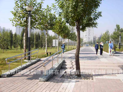 2.3 現代城市公園設計中的生態化、人性化、個性化 2.3.1 城市公園的生態化 朝陽公園植被景觀 城市公園正從“咫尺園林”的微觀尺度向“大地園林”“生態園林”的宏觀尺度發展,F代城市公園作為城市綠地系統的重要組成部分,維持城市生態系統的多樣性和穩定性是城市公園的一個重要作用。設計應以自然布局為主,充分利用原有的自然地形地貌和自然植物群落,景區中的主要景觀建筑要與大自然流暢質樸的情趣相協調,不能把城市公園當作一處游樂場或娛樂場所來規劃,一個真正的公園可以沒有各種娛樂設施,但是不能沒有綠色植被,如朝陽公園大面積的綠地和合理的植物群落,為城市的生態系統建設起到很大作用(圖7)。 2.3.2 設計中體現人性化 公園道路五障礙設計