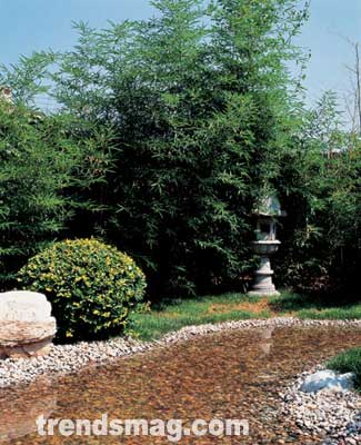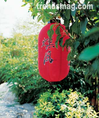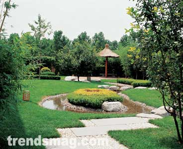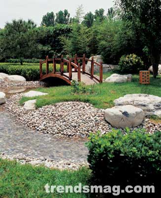 雖然由于面積的限制,不可能有供乘船游覽的水路,但水仍是必不可少。園子的一角立著三塊巨大的山巖,高低參差,兩邊的兩塊古拙渾樸,中間的一塊卻平整光滑。流水從最高的一塊山巖后發源,從中間那一塊的上端靜靜緩緩地流過,再由那刀削般的巖壁直掛而下,沖落在巖腳下的一塊大山石上,飛珠濺玉。在巖腳下積成一口小潭后,又從鵝卵石鋪就的水道上蜿蜒淌過,流成一條小溪。根據日本平安時代的造園專著《作庭記》記載:庭院中的水應從東向西流,即把青龍(東方)方清潔的水導入,向白虎(西方)方流出,排出宅邸內的污物。而另一種陰陽說則主張水應從陰向陽流,即從玄武(北方)流向朱雀(南方),則陰陽調和。后來將這二者結合起來的最好的折中方法是把水從東方引入,向南流動,最后向西流出。現代的人自然沒有這許多避諱,但水流設置依舊需是婉轉曲折又一脈貫穿。從那些黑白分明、玲瓏剔透的石子上流淌而過時,低低的汩汩的聲音便是水的輕吟。