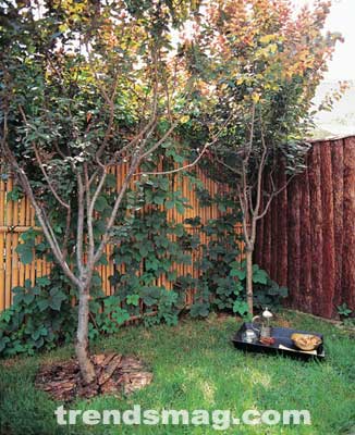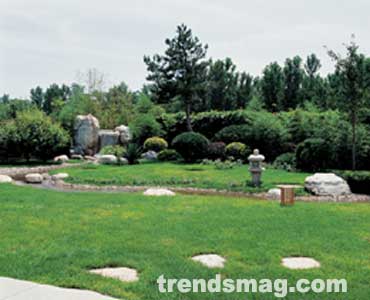 同一園內的植物品種不必多,一般應以一二種植物作為主景植物(以常綠植物為首選),再選用另一二種植物作為搭配,層次清楚、形式簡潔而美觀。從高處鳥瞰園林時,可能會看到整片庭園樹林中所植均為某一種樹。幾種植物的配置(例如用一棵松樹和幾叢杜鵑)則能夠形成豐富多變、構圖均衡的各種空間。對植物的修整技藝中也可以體現對空間的處理和認識。例如,有的植物修整旨在展開樹木,使其枝干間的空間層次分明。常綠植物不僅可以經年保持園林風貌,也為色澤淺亮的觀花、觀葉植物提供了一道天然背景。而且以常綠植物為主構成的園林并不一定色彩單調,它們的綠色也有濃淡之別;有些常綠植物在春季會長出淺綠色的針葉和球果,或秋季結紅色或藍色的漿果,從而使園林色彩更為豐富。