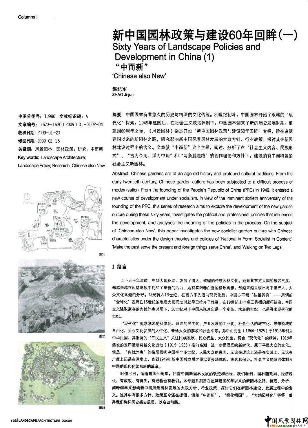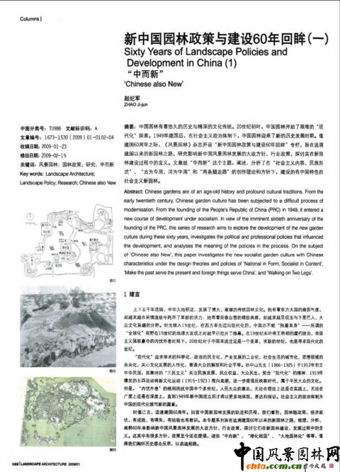 摘要:中國園林有著悠久的歷史與精神的文化傳統(tǒng)。20世紀初葉,中國園林開始了艱難的“現(xiàn)代化”探索。1949年建國后,在社會主義政治體制下,中國園林迎來了新的歷史發(fā)展時期。值建國60周年之際,《風景園林》雜志開設“新中國園林政策與建設60年回眸”專欄,旨在追溯建國以來的新園林之路,研究影響新中國風景園林發(fā)展的大政方針、行業(yè)政策,探討其在新園林建設過程中的含義。文章就“中而新”這個主題,闡述、分析了在“社會主義內(nèi)容、民族形式”、“古為今用、洋為中用”和“兩條腿走路”的創(chuàng)作理論和方針下,建設的有中國特色的社會主義新園林。 ![]() ![]()