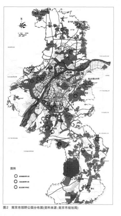 總之,郊野公園兼具資源保護和合理利用的特征,是一種特殊類型的綠色開放空間。同時,郊野公園不只是一種規劃概念,而是進入了控制性用地規劃的層面,屬于綠線劃定范圍內的以建設實施為目標的公共綠地,是城市開放空間和綠地系統的組成類型之一。 1.2郊野公園的實踐 郊野公園在近代的早期實踐可見于美國城市近郊的公園、墓園和游憩地,英國鄉野的鄉村公園(countrysidepark)等。我國在1980年以后實施的風景區和森林公園等,在鄰近城市邊緣地帶的區位也具有類似的特征。1971年港英當局提出了第一個郊野公園發展五年計劃(1972—1977年),并于次年獲得立法通過。1976年以立法形式頒布了《郊野公園條例》①。從1977年始,20余年間劃定實施了23個郊野公園和15個特別保護區,占地40000多hm2,覆蓋全港土地的40%以上。2000年以來,內地一些城市借鑒香港郊野公園的模式,從城市發展和生態環境維護的需求出發,在城市邊緣地帶規劃和建設了一批郊野公園: 深圳從2003年開始,按照《深圳市綠地系統規劃(2004—2020)》,在全市劃定森林、郊野公園的建設控制區,啟動了21個郊野公園的規劃建設,已建和在建的近10個。北京在新一輪總體規劃(2004—2020年)的北京市域綠地結構中,提出建立四大郊野公園作為國家公園,分別位于北京城歷史軸和發展軸的頂端,與楔形綠地構成圍繞中心城區外緣的郊野公園環,用于抑制中心城市以“同心圓”模式蔓延,從結構上將北京的綠地系統聯成一個整體,優化城市綠地生態功能[2](圖1)。在2007年的《南京市域綠地系統規劃》中,郊野公園是重要的內容之一。目的是為了在城市快速擴張過程中,更好地保護近郊地區的生態景觀資源,有效引導郊野公園和綠色產業的開發。規劃根據當地的資源特點進行了郊野公園的選址與分類布局,同時還劃定了郊野公園的綠化控制線,提出了郊野公園的建設原則(圖2)。此外,成都、廣州、上海、東莞等大中城市也先后規劃建設了一批郊野公園。在當前城市空間急劇擴張的背景下,在邊緣區不斷受到各種經濟活動影響下,郊野公園的出現和迅速增長值得予以關注。 1.3郊野公園發展的背景 通過設置國家公園來保護公共風景資源的做法最早來自美國,1872年美國創建了第一個國家公園——黃石公園,旨在保護自然美景免遭人類活動的侵害。自1916年創立國家公園系統以來,已建有368個保護區單位,覆蓋面積達3300萬hm2[3]。香港郊野公園是隨著香港20世紀60年代經濟騰飛,新市鎮的急劇擴張而出現的,最初是為了保護當地自然環境并向市民提供郊野游樂和教育場所設施。到20世紀90年代,進一步強調整體的郊野資源保護,促進自然保育,大大擴展了郊野公園的規模和范圍。因此香港在經濟高速發展的背景下,仍舊保留和擁有繁多的野生生物物種和高度的生物多樣性。郊野公園與新市鎮在發展時機、土地利用、功能發揮幾方面互相呼應、制約和補充,起到了遏制城市盲目擴展的勢頭,實現了土地發展需求與自然環境保護之間的合理平衡[4]。在我國當前快速發展的城市化進程中,城市空間呈外拓式擴張和蔓延,城市邊緣區的土地不斷轉化為建設用地。市場經濟的逐利行為導致了對附著于土地的自然風景資源的占有和私有化,和不適當的開發造成對“圈地”邊緣區公共風景資源和綠地的劫掠和破壞。綠帶、綠圈等紙上的規劃畢竟抵抗不過市場經濟自主發展強大的內驅力。在這種背景下,通過設立郊野公園制度,將城市邊緣區內具有較強生態作用和結構性意義的開放空間和生態、美學、人文、游憩等價值較高的自然風景資源,在經濟開發活動發生之前,給予預先保護,實行實質性的用地控制是城市發展的一種明智的策略選擇。這也是郊野公園發展最重要的功能目標之一。 2郊野公園的發展模式與策略 香港的郊野公園發展是與其城市人口、地理、資源、土地等現狀,包括法規制度和城市發展的戰略目標緊密相關的。我們主張的郊野公園的發展也是以資源保護和適度利用為宗旨的,但由于制度和地方的差異,郊野公園發展有著不同的模式,體現在土地獲得、選址與規劃等一系列的發展策略上。 2.1郊野公園的土地獲得 以政府為主導的郊野公園的開發影響到郊區土地利用模式的轉變,土地獲得將是郊野公園發展的先決條件。在城市遠近郊區,通常土地利用模式多樣,權屬復雜。除部分企事業、居住區、基礎設施等已建設用地外,大部分屬農用地,包括耕地、林地、牧草地、農田水利用地、養殖水面和山林陡坡、低洼濕地、空棄曠地等。在城鄉規劃所覆蓋的市域規劃范圍內,應在國家基本農田保護制度下,實行農業用地優先、自然資源保護用地優先;在此基礎上考慮未來發展建設的儲備用地,包括區域交通、工礦、倉儲用地等其他用地等。在我國現有的土地制度框架內,郊野公園的土地獲得方式主要是通過劃撥和征用:1)申請劃撥未利用的國有荒山野嶺、荒灘溪澗、閑置荒地等①;2)以公共利益的名義,征用國家所有制土地和集體所有制的農用地,包括山林、水體等,但應給予相應的補償。郊野公園屬國家所有,劃撥或征用土地應成為主要方式。然而,在市場經濟條件下,無論是國有土地還是集體土地,都趨向于追求更好的經濟回報。土地日益高漲的市場價值將使政府公共財政負擔郊野公園建設的成本不斷上升,從而影響到郊野公園的土地獲得和發