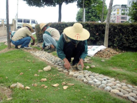 據了解,這些道路花壇側石和人行道都已經過改造,樹穴改造是配套工程,預計到9月初完成。經過改造后的這些道路目前已經成為諸暨市景觀效果最好的道路。圖為園林工人在鋪設卵石。