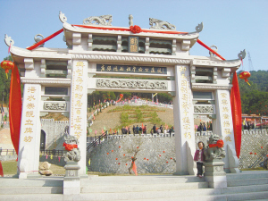 相關負責人介紹,黃肇綸陵園位于翔安新圩鎮金柄村大侖山,為唐朝監察御史黃肇綸及其夫人智氏合葬之墓。在來自各地黃氏宗族的倡議下,于1997年開始修建,一期建成陵園基本輪廓。2002年,合族宗親再次倡議發起二期擴建,占地80畝。蜿蜒曲折的城墻、緬懷先祖發源地的古城門———“追元門”,配以各式的廊、亭、苑、拱橋等景觀,以及一個桑蓮池和宮殿式建筑———齊賢堂。其中,山麓正坡面一個巨大的“黃”字格外顯眼。據介紹,該字是以樹按字形種植而成,寬22米,高約38米。“這樣即使在很遠的地方都能看到此字,既能保持水土,還能顯示是黃氏發祥地。”該負責人說,此做法在當地應屬首次。整個工程耗資234萬元,歷時7年。