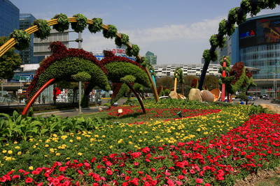 隨著世博腳步的日益臨近,楊浦區綠化署、綠化公司用萬盆鮮花扮靚五角場核心區域。此次改造主要圍繞“一點、一環、兩片、五角”展開。通過下沉式廣場、中央環島、街頭花壇、五角場廣場的景觀布置,烘托出楊浦濃烈的節日氣氛。其中最引人注目的“世博海洋”主題景點位于五角場黃興路、淞滬路中央隔離帶上,綠化面積共計4500M2,上部景觀保留了原有拱跨,放置懸掛花球,組成流動的浪潮,而環繞綠地的則是18組形態各異的海豚造型的立體花卉構架,在2410M2鮮花花海之中翻滾躍動,充分展現楊浦將以海一般的熱情迎接八方來客!