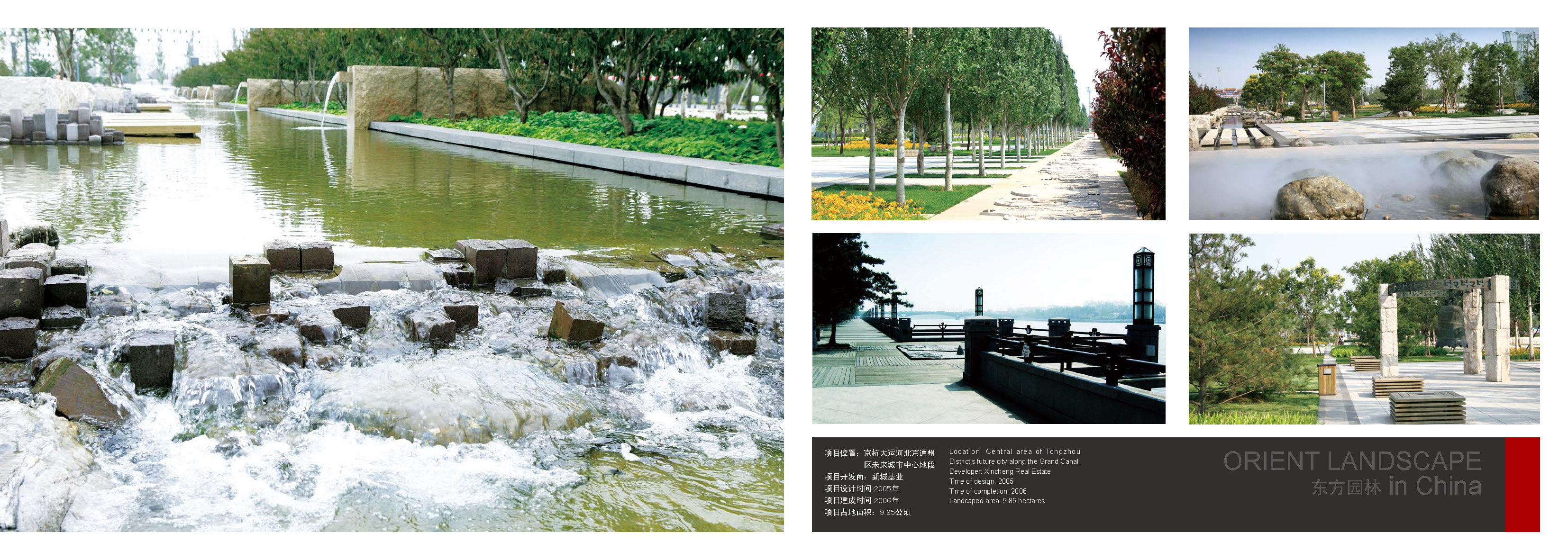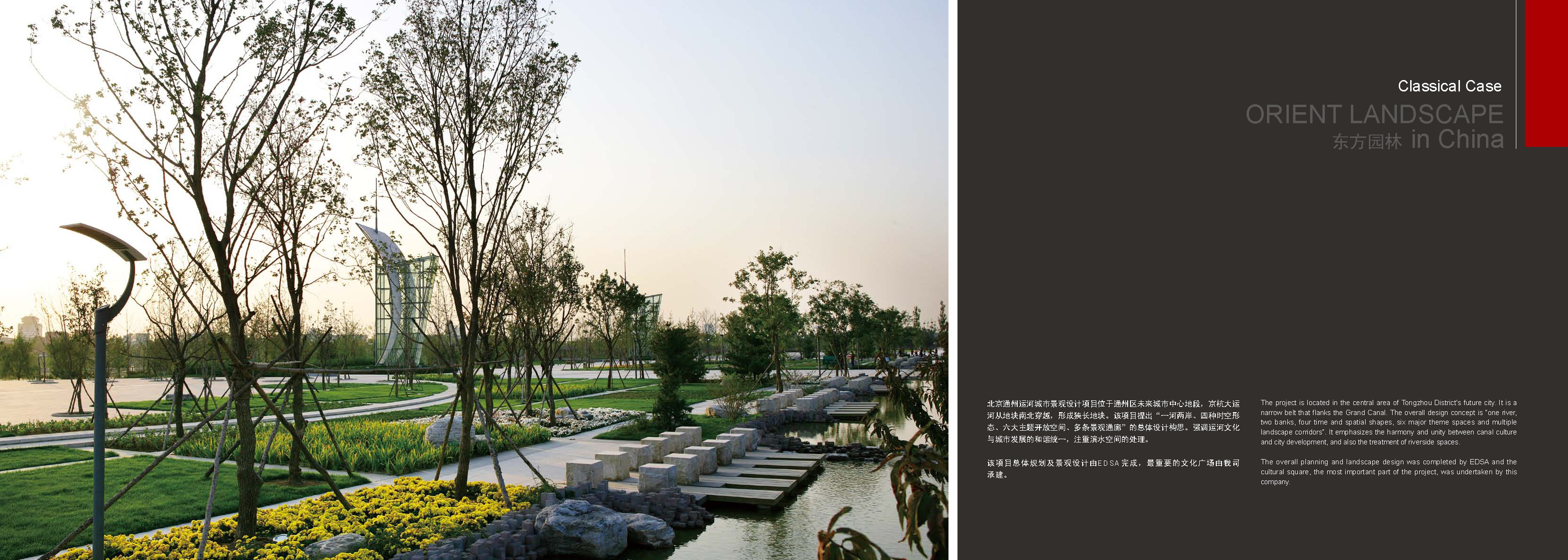 該項(xiàng)目總體規(guī)劃及景觀設(shè)計(jì)由EDSA完成,最重要的文化廣場(chǎng)由北京東方園林股份有限公司承建。北京通州運(yùn)河城市景觀設(shè)計(jì)項(xiàng)目位于通州區(qū)未來(lái)城市中心地段,京杭大運(yùn)河從地塊南北穿越,形成狹長(zhǎng)地塊。該項(xiàng)目提出“一河兩岸、四種時(shí)空形態(tài)、六大主題開放空間、多條景觀通廊”的總體設(shè)計(jì)構(gòu)思。強(qiáng)調(diào)運(yùn)河文化與城市發(fā)展的和諧統(tǒng)一,注重濱水空間的處理。